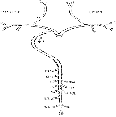 In the arterial system of poultry, the aorta swings to the right side of the body after leaving the heart (Figure 1-10-1). The arteries to the head are the common carotids (Figure 1-10-2) which divide into external (Figure 1-10-3) and internal (Figure 1-10-4) branches. The shoulder and wing are supplied by the brachial (Figure 1-10-5), the large flight muscles covering the sternum by the pectoral (Figure 1-10-6), and the ribs by the subclavian (Figure 1-10-7). The first visceral branch of the aorta is the coeliac (Figure 1-10-8) to the proventriculus, gizzard, spleen, liver, and pancreas. The anterior mesenteric (Figure 1-10-9) supplies the intestine. After the renals (Figure 1-10-10) to the kidneys are two major pairs of arteries to the leg, the external iliacs (Figure 1-10-11) and sciatics (Figure 1-10-12). The intestine also is supplied from the posterior mesenteric (Figure 1-10-13). The internal iliacs (Figure 1-10-14) and caudal (Figure 1-10-15) supply the cloaca and tail, respectively.