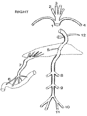 In the venous system of meat animals, the anterior vena cava (Figures 1-11-1) receives blood from the external (Figure 1-11-2) and internal jugulars (Figure 1-11-3) that drain the head, and from the brachials (Figure 1-11-4) that drain the forelimb. The posterior vena cava passes through the liver where it receives blood from the hepatic vein (Figure 1-11-5). The mesenterics (Figure 1-11-6) collect blood with digested nutrients from the intestines and take it to the liver in the hepatic portal vein (Figure 1-11-7) to be processed before being returned to the general circulation. The remaining major inputs to the posterior vena cava are the renals (Figure 1-11-8) from the kidneys, the ovarian or spermatic veins (depending on the sex of the animal, Figure 1-11-9)), the external iliacs (Figure 1-11-10) from the hindlimb, and the internal iliacs (Figure 1-11-11) from the penis or udder. The vena azygos (Figure 1-11-12) is a single vein on the right side of the body, running posteriorly along the vertebral column, but in the diagram it has been deflected so that it does not look as if it runs from the liver.