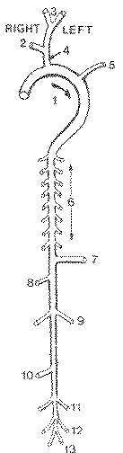 In the arterial system of meat animals, the aorta bends to the left side of the body (Figure 1-9-1), and then runs posteriorly in the midline, ventral to the vertebral column. The right forelimb is supplied from the right brachial (Figure 1-9-2) which, like the common carotids (Figure 1-9-3) to the head, branches from the brachiocephalic trunk (Figure 1-9-4). The left brachial (Figure 1-9-5) to the left forelimb originates directly from the aorta. As it passes under the vertebral column in the ribcage, the aorta gives rise to a series of small intercostal arteries (Figure 1-9-6) before the first main branch to the viscera, the coeliac (Figure 1-9-7). In cattle, the coeliac artery has five main branches; (1) the hepatic to the liver, pancreas and nearby structures, (2) left and (3) right ruminals to the rumen, (4) an omaso-abomasal artery to the omasum and abomasum, and (5) the splenic to the spleen. Proceeding posteriorly, the remaining major branches from the aorta are the anterior mesenteric (Figure 1-9-8), right and left renals (Figure 1-9-9), posterior mesenteric (Figure 1-9-10), a spermatic or utero-ovarian artery (depending on the sex of the animal, Figure 1-9-11), and the external (Figure 1-9-12) and internal iliacs (Figure 1-9-13) to the hindlimb and rump.
